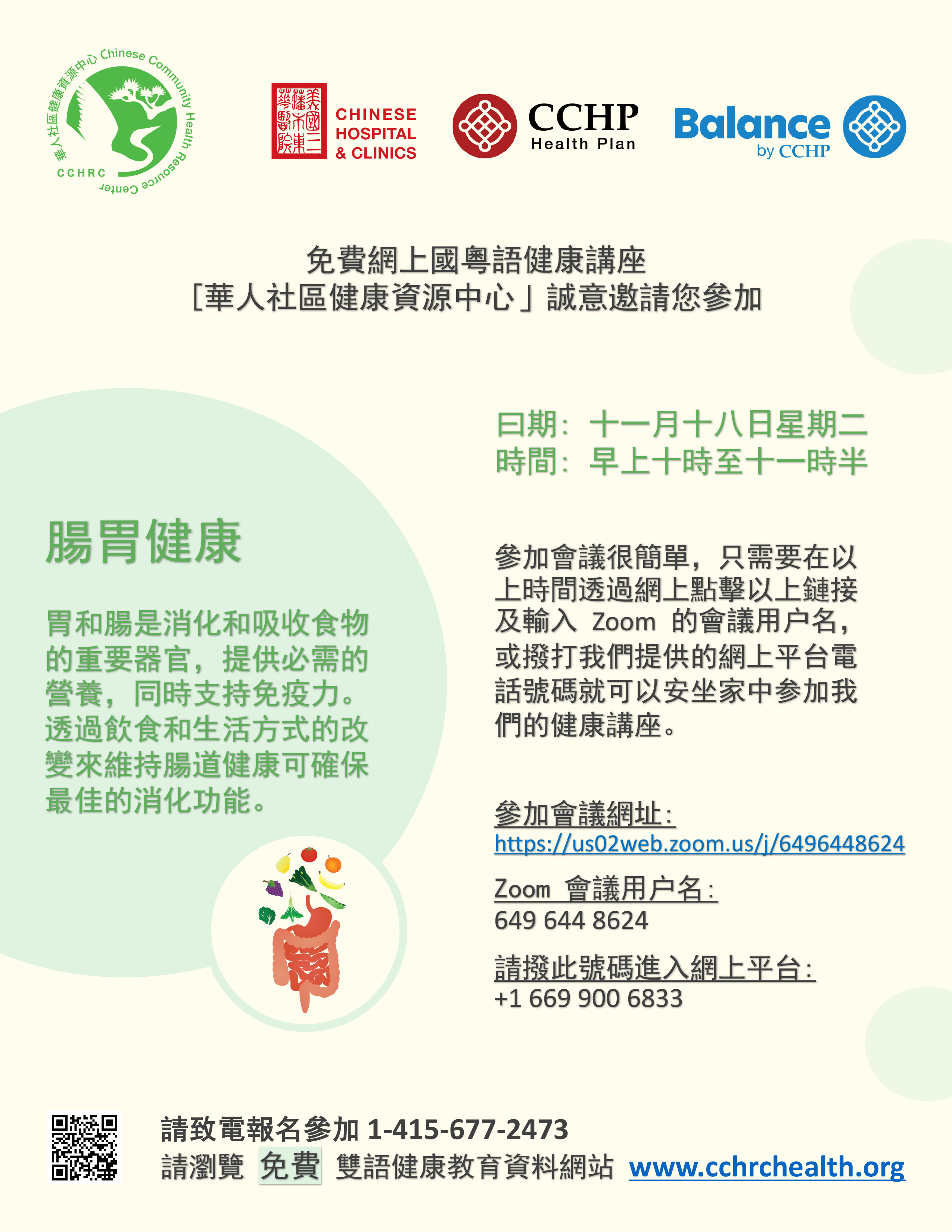 如果您想參加以下的腸胃健康講座, 請點擊此處的 Zoom 鏈接: https://us02web.zoom.us/j/6496448624 在十一月十八日星期二, 早上十時至十一時半。